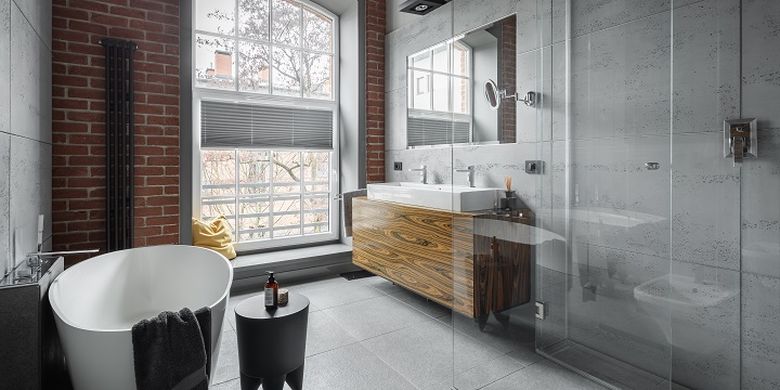 Tema industrial sering dikaitkan dengan warna-warna netral seperti abu-abu, putih, dan hitam. Kamu bisa mulai mengubah warna dinding kamar mandi dan perabotannya menjadi warna-warna netral.