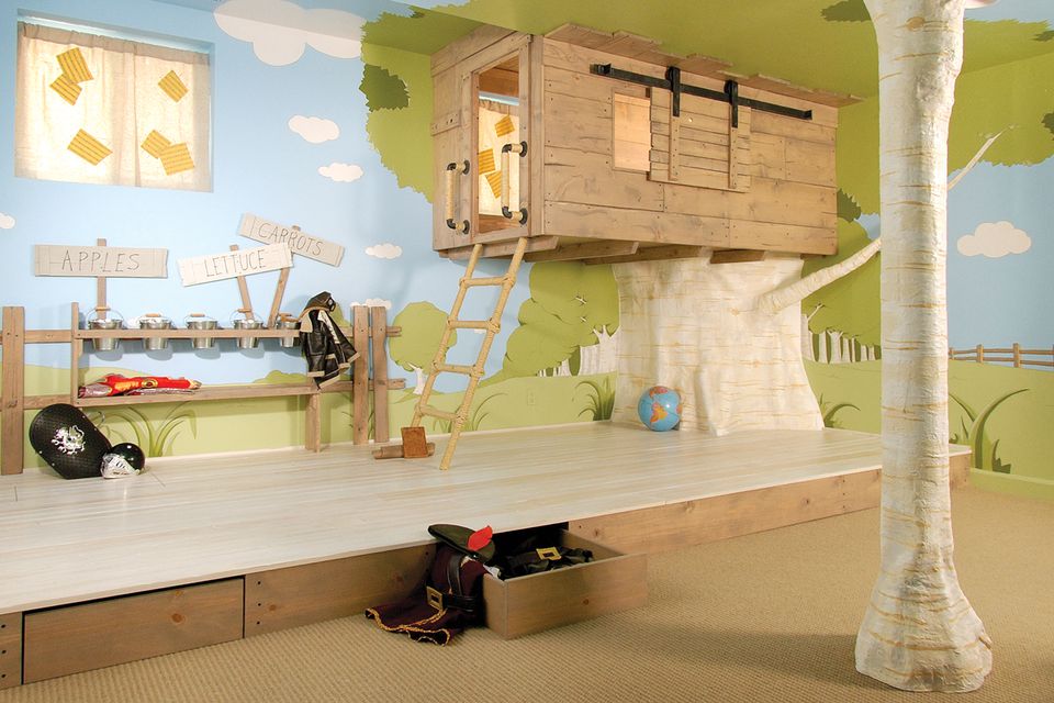 Terinspirasi dari rumah pohon, ruang bermain indoor ini memiliki area panggung dengan rak penyimpanan lantai built-in. Ada pula pohon buatan untuk menambah kesan alami di dalam tempat untuk anak bermain. Anda juga bisa menambahkan ayunan sebagai dekorasi tambahan.
