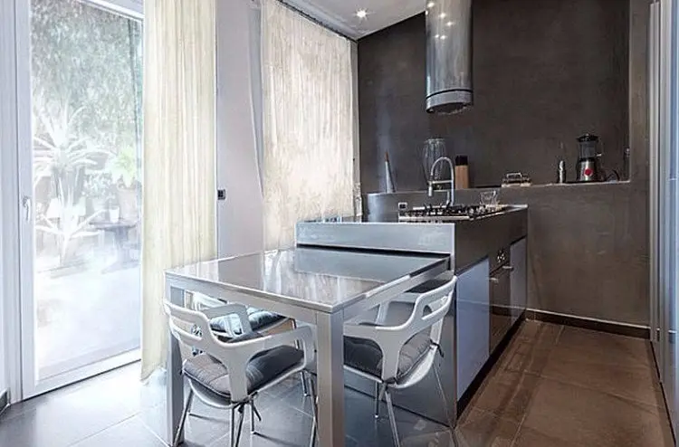 Supaya dapur minimalis mungil terlihat lebih rapi misalnya dapur minimalis ukuran 2x3 letakkan meja makan di samping kitchen island tersebut supaya kamu tidak perlu repot melangkah jauh untuk menyajikan makanan atau saat merapikan piring. Dominasi warna abu-abu juga cocok untuk dapur minimalis agar memiliki sentuhan yang sedikit modern.