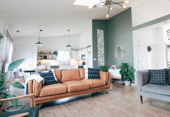 Ruang tamu dengan kombinasi warna putih dan krem ini akan membuatnya terlihat lebih bersih dan luas. Kamu dapat menggunakan perabotan berwarna serba putih dan krim. Tambahkan sedikit aksen kayu dan tanaman hias untuk memunculkan kesan natural.