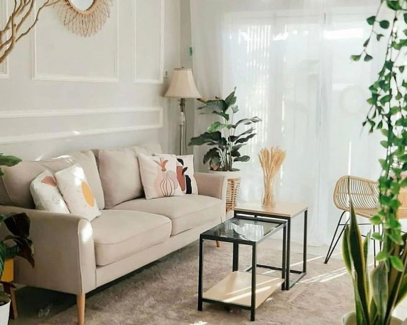 Kamu dapat mencoba menggunakan perabotan berwarna krim dan mengkombinasikannya dengan tanaman hias di berbagai sudut ruang tamu. Gunakanlah juga tanaman rambat di dinding ruangan untuk menambah kesan segarnya.