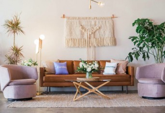 Ruang tamu yang dapat memberi kesan hangat tentunya juga membuat nyaman. Warna coklat dapat kamu gunakan untuk sofa dan beberapa perabotan lainnya. Tambahkan juga tanaman hias di sudut ruang tamu dan rak minimalis untuk memberikan kesan elegan.