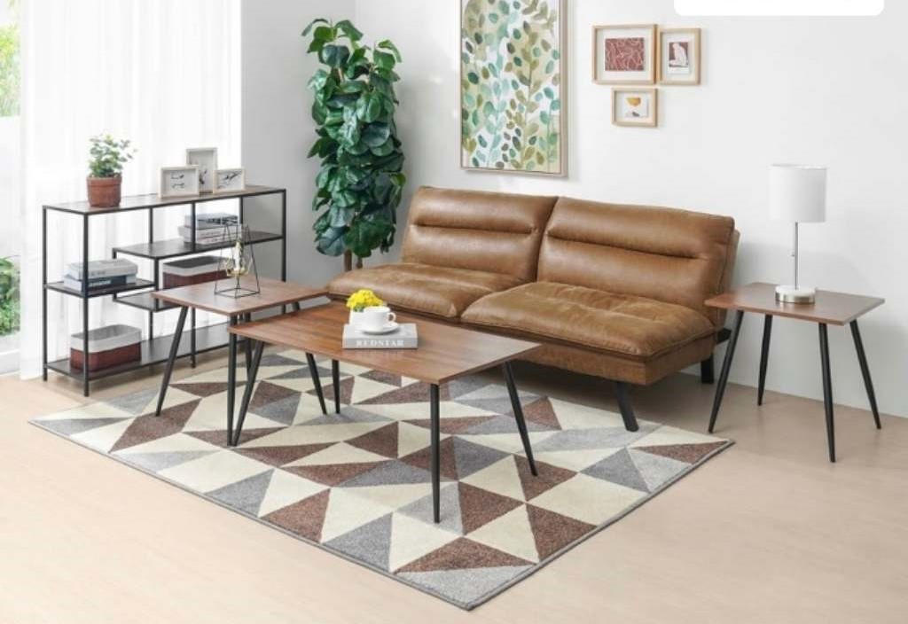 Ruang tamu dengan Nuansa coklat dengan tambahan rak besi