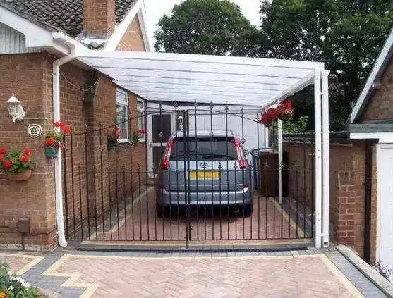 Gunakan pagar besi sebagai penutup garasi dan kanopi berbahan fiber glass untuk atapnya.