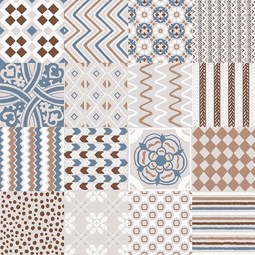 Pola kontemporer dari koleksi Mozaico memadukan tampilan semen dengan desain geometris artisanal modern dalam warna-warna tanah yang halus, menciptakan pengalaman visual yang unik pada dinding dan lantai.